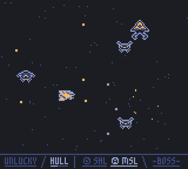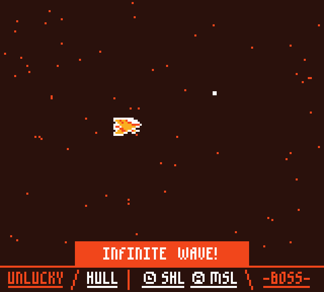 damage up for each missing hull points | bad luck + 2 | regen 1 hull HP every 10 kills | shot frequency increases every 6 kills per wave |